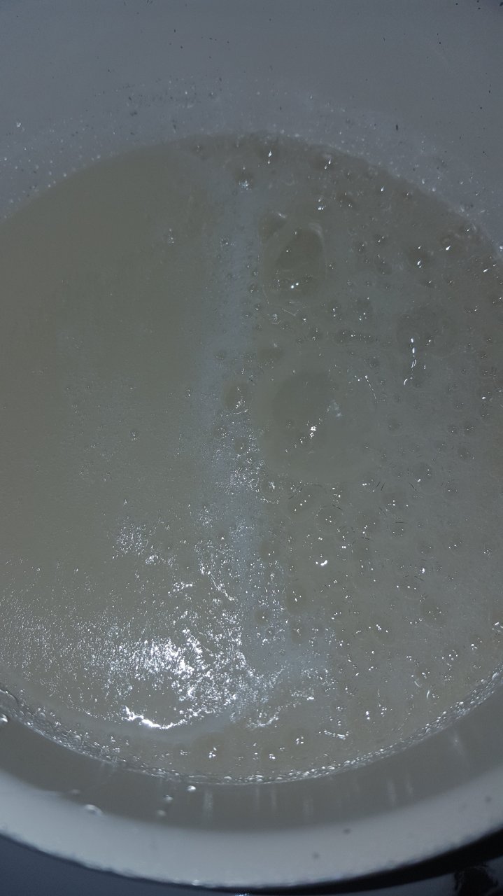 Boil corn syrup and sugar in medium pot until boiling then immediately remove from eye and set aside to slightly cool.